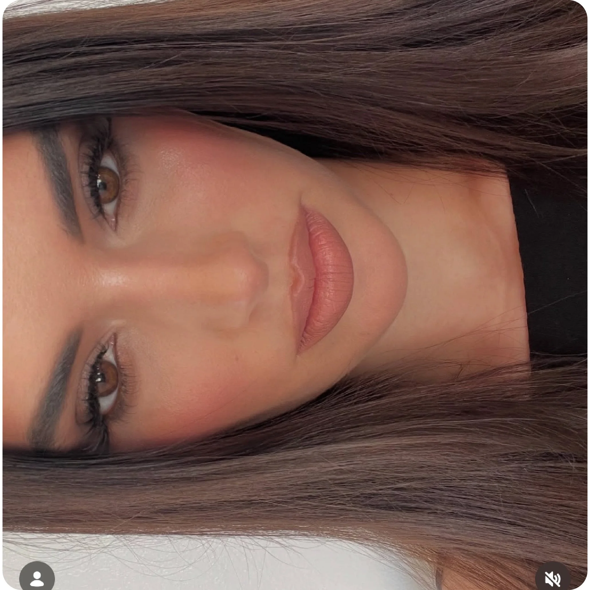 Flawless skin tone, blush, brows, soft eye contour, and nude lips.